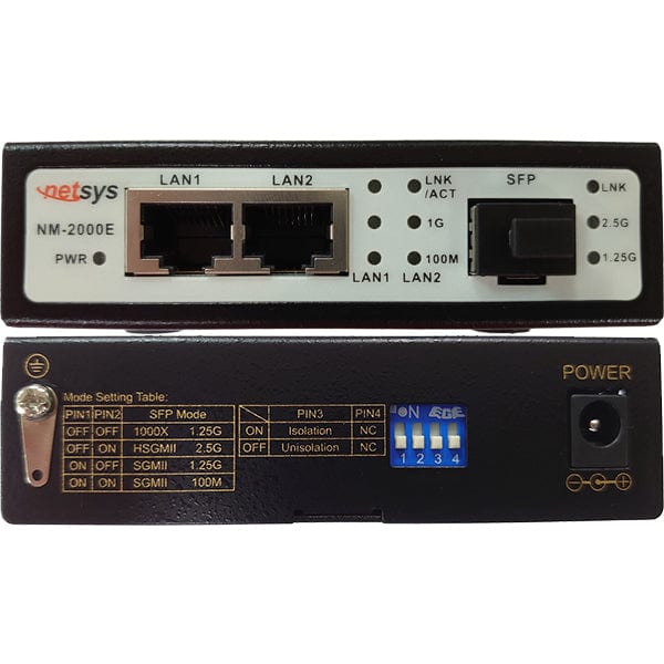 The Netsys GigaPort 1.25G (10km) Single Strand Single Mode Fiber Media Converter Kit (NM-2000ESKIT) includes 2 X NM-2000E GigaPort Fiber Media Converters, 1 X NSB1513-3LCD25 SFP module, 1 x NSB1315-3LCD20 SFP module, and provides a point-to-point Ethernet network extension up to 32,800 feet (10km) using a single strand of single mode fiber. The rear DIP switch panel allows users to enable/disable isolation mode for the RJ-45 Ethernet Ports and link fault passthrough, as well as selecting 100M/1.25G/2.5G SFP mode.
